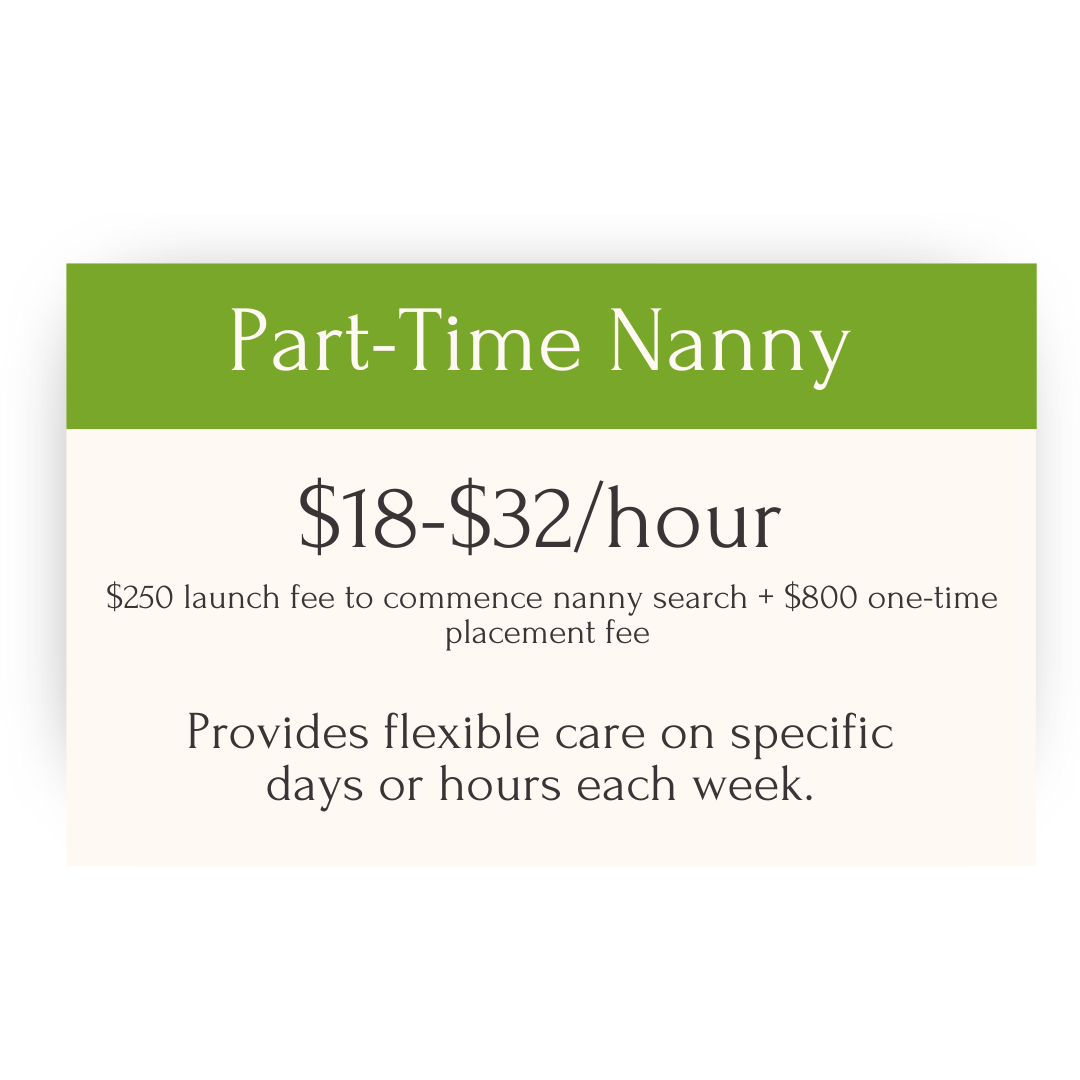 Part-Time Nannies work between 20-35 hours per week. Schedules can vary from 3-5 days per week, with a minimum of 20 hours per week. We’ll work with you to determine a set schedule that works for everyone!