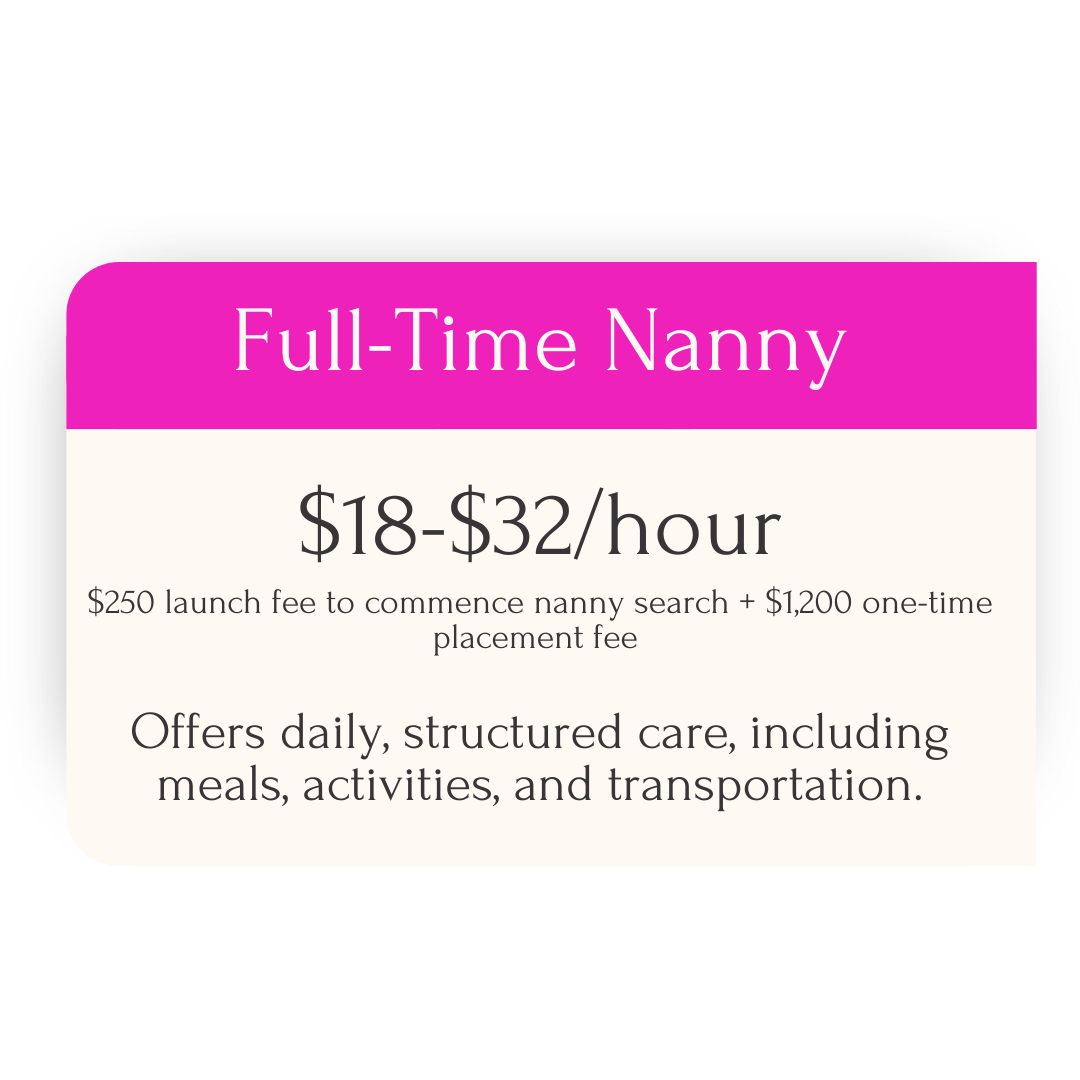 Full time nannies work between 40- 45 hours per week. Five days a week. Should you find that your caregiver isn't the perfect match, we're committed to finding a replacement up to 6 months. Your confidence is our priority.